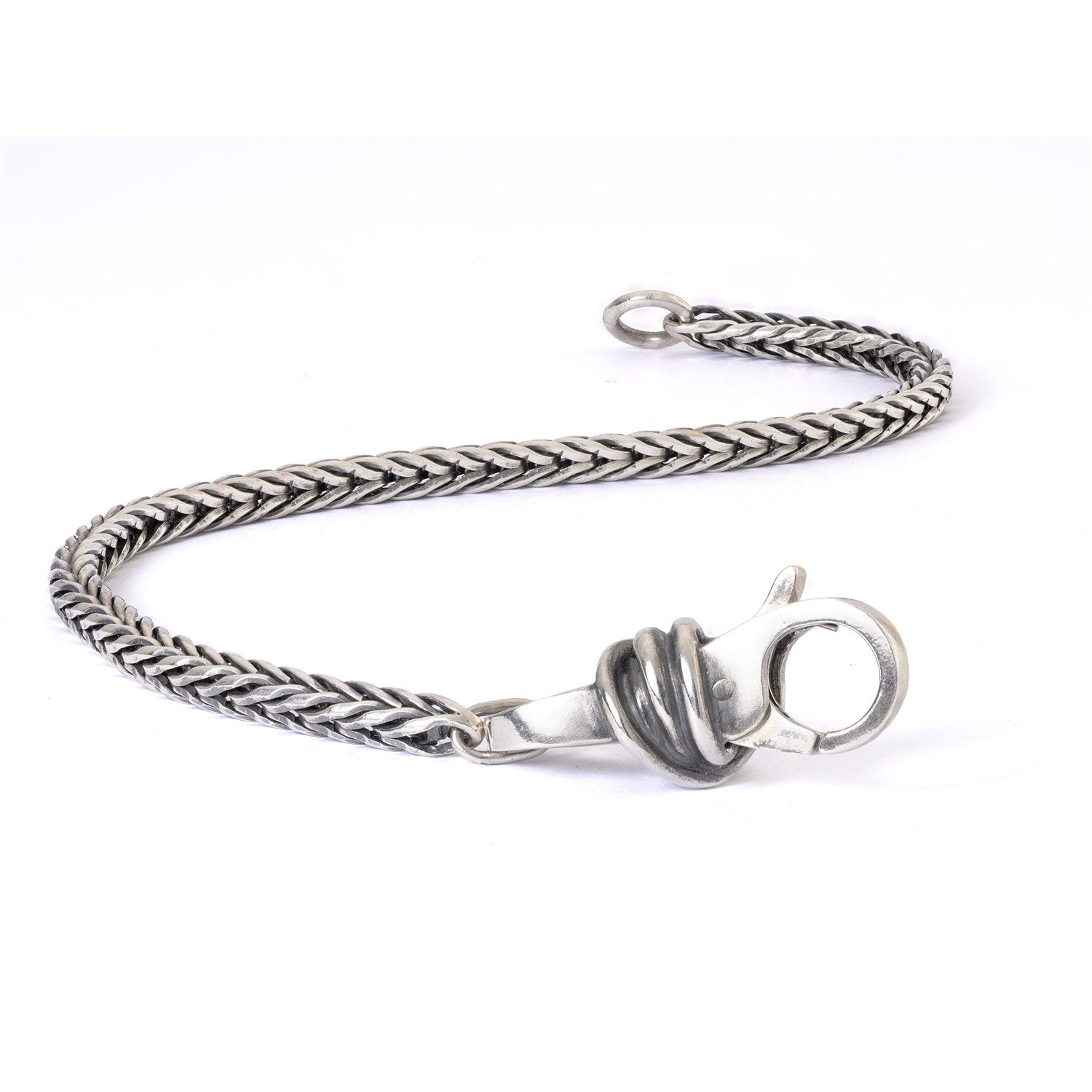 A silver foxtail bracelet chain with a sterling silver Lucky Knot Clasp, combined in a Limited Edition piece. This is a special 50th Jubilee design inspired by one of the first and most beloved beads, Lucky Knot, shaped as a knot that symbolizes connection and continuity.